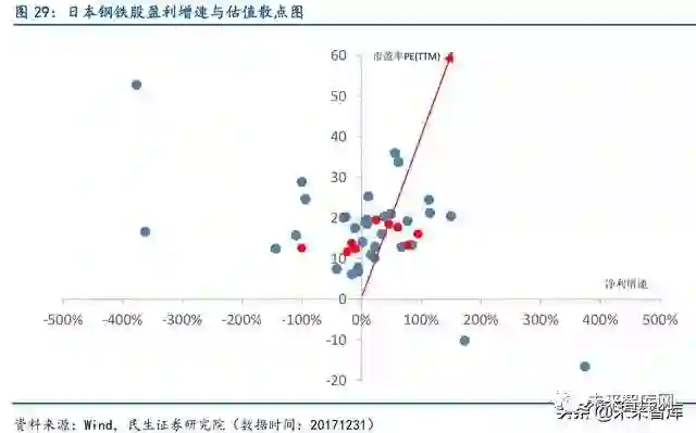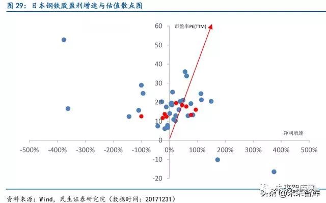 日本钢铁股估值较为合理,特钢存在一定估值溢价。从日本上市钢铁公的盈利增速与市 盈率制的散点图中可以看出,日本上市钢铁公司估值相对集中在10-20 倍区间。通过将特钢 公司标红,我们可以清楚看到特钢公司估值与非特钢公司相近,但多集中在区间中上部,多 数存在一定估值溢价现象。