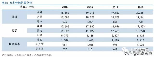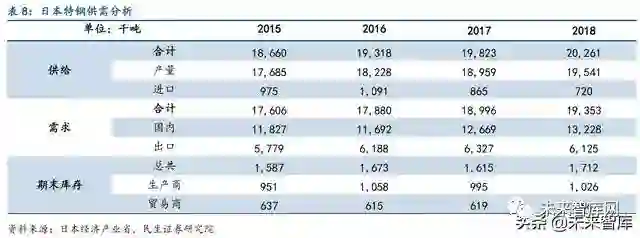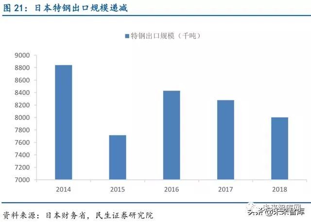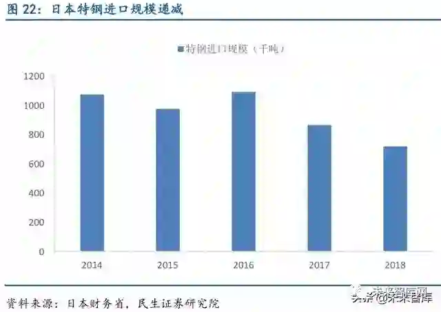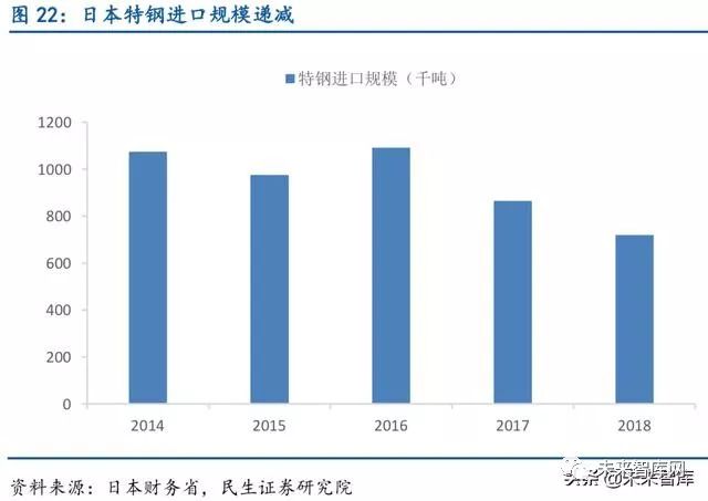 日本特钢进口量相对较少,完全实现自给自足。日本特钢年进口规模相对出口很少,2018 年进口72 万吨,仅占2018 年特钢产量的3.5%,较2017 年进口规模下降约17%,日本制造 业对特钢的需求已经基本实现自给自足。