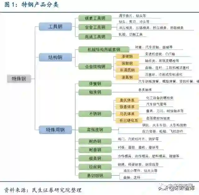 特殊钢产品种类丰富,具有不同特殊性能。钢可以分为普钢和特钢两大类型,特钢即特 殊钢,是与普钢相对的概念,专指由于成分、结构、生产工艺特殊而具有特殊物理、化学性 能或者特殊用途的钢铁产品。与普钢相比,特钢生产工艺更复杂、技术水平要求更高、生产 规模更为集约,下游应用主要集中于国防、电力、石化、核电、环保、汽车、航空、船舶、 铁路等行业的高端、特种装备制造领域。特殊钢产品种类丰富,按用途分为工具钢、结构钢 与特殊用途钢三大类,其中特殊用途钢包括弹簧钢、轴承钢、不锈钢、高强度钢、耐热钢、 耐磨钢、模具钢等。特殊钢中种类最多的是合金钢,是在碳素钢中适量地加入一种或几种合 金元素后使钢的组织结构发生变化,从而使钢具有各种不同的特殊性能,如强度、硬度大, 可塑性、韧性好,耐磨,耐腐蚀,以及其他许多优良性能。