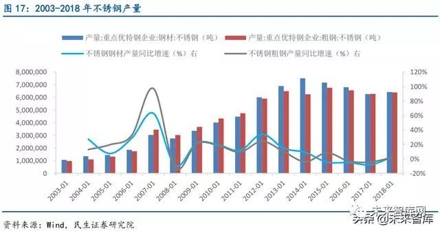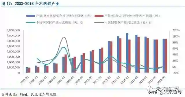 近年不锈钢产销增速放缓,受益高端制造未来需求仍有望保持稳定。随着下游应用领域的不断增加和装备制造业对不锈钢材料品质要求的不断提升,不锈钢产品需求日益旺盛,近 年来全球不锈钢粗钢产销量呈现出不断增长的态势。随着工业化推进,2003-2018 年我国不 锈钢钢材产量从106 万吨增长至641 万吨,年均增速14%,不锈钢粗钢产量从98 万吨增长至639 万吨,年均增速15%。从特钢协会统计的数据来看,自2004 年以来,我国不锈钢的表观 消费量总体保持增长,从2004 年447 万吨,到2016 年已经达到1883.53 万吨,年复合增长 率高达12.73%,不锈钢消费对进口的依赖逐渐减小。随着我国未来不锈钢在工业用和民用领 域的不断普及以及高端制造的快速发展,不锈钢的消费仍有望保持稳定增长。