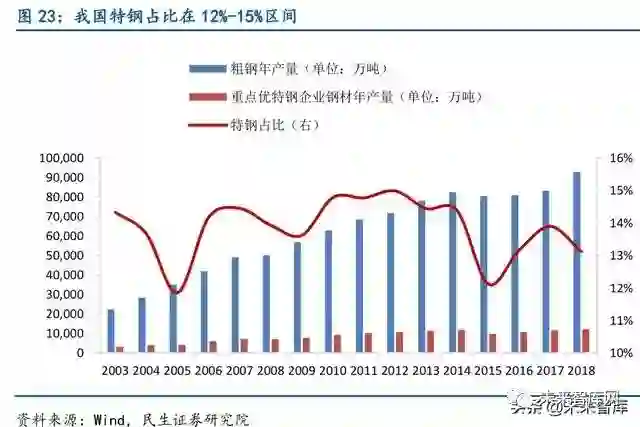 对标日本特钢占比,我国应有1.9 亿吨特钢产量。我国自1996 年粗钢产量首次突破亿吨大关后,粗钢产量不断增长,到2018 年已连续22 年保持钢产量世界前列。中国已成为世 界钢铁大国,但由于特钢产量与质量的限制,所以我国还不能算作世界钢铁强国。我国特钢 占比较低,2003 年至2018 年,我国特钢产量占粗钢产量均不到15%。2014 年开始我国特钢 比开始下滑,由14.38%下降至12.12%,在2017 年回升至13.89%后再次在2018 年下滑。日 本特钢是在粗钢产量见顶后开始快速发展起来,我国近年粗钢产量基本维持在8 亿至9 亿吨, 如果按照日本2017 年21.4%的特钢比,我国2018 年应有19864.85 万吨特钢产量,而2018 年实际特钢产量规模仅有12176.22 万吨,存在7688.63 万吨产量差。