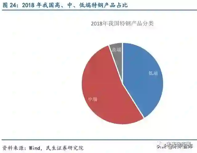 我国特钢中低端产品占比高,高端产品与国外先进水平存在差距。按照碳素钢为低端特 钢,合金钢为中端特钢,高合金钢为高端特钢的标准对我国2018 年特钢产品进行分类,我 们发现我国特钢产品结构主要以中低端产品为主,其中,中端产品占比超50%,低端产品占 比约40%,而高端产品占比不足10%。与日本高、中、低端产品30%、49%、21%的占比相比, 我国低端产品有明显竞争优势,终端产品与日本水平相近,而高端产品与日本存在较大差距。