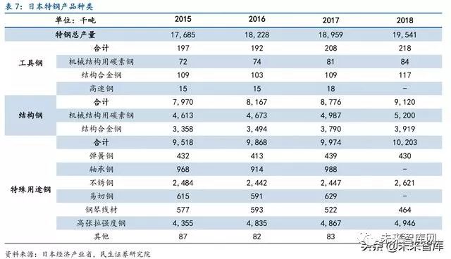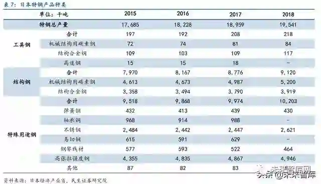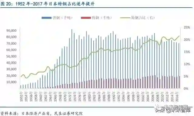 日本粗钢产量见顶后特钢发展加速,是其高端制造业全球竞争力的源泉。日本特钢产量 与质量均在全球钢铁行业中排名居前,是支撑日本汽车、火车、工程机械、能源设备等高附 加值产品全球竞争的重要基石,是日本经济发展的源泉,特钢行业的发展在日本经济中的地 位越来越重要。日本粗钢产量在1973 年以1.2 亿吨见顶,此后一直稳定在1 亿吨左右。特 钢产量1952 年仅24 万吨,钢材占比4.8%,至粗钢见顶时的1973 年,特钢产量约888 万吨, 占钢材的8.8%。随后日本特钢产量开始了迅猛发展,在1977 年产量突破1000 万吨,钢材占 比接近12%,在2007 年达到2060 万吨的历史峰值,钢材占比达到19.4%。虽然近十年特钢 产量略有下降,但特钢占比不断上升,2017 年达到历史最高的21.4%,特钢占比的提升也反 映出日本钢铁产业在向高附加值、高科技产品转型,从而支撑其高端制造业不断增长的需求。