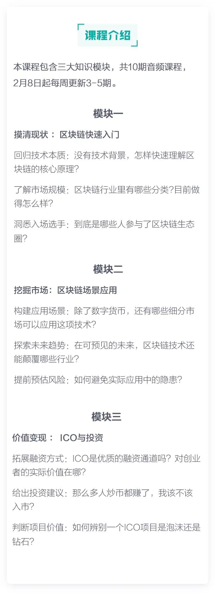 为了让更多人了解和学习区块链,我们和思否区块链技术社区创始人高阳合作开发了《如何在区块链浪潮中找到项目机会》一档区块链音频学习课程。