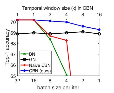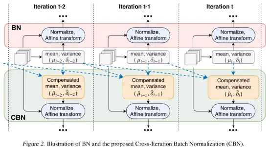 不然的话,非但不能发挥BN的优势,甚至会适得其反。但是由于算力的限制,有时我们无法使用足够大的batchsize,此时该如何使用BN呢?本文介绍两篇在小batchsize也可以发挥BN性能的方法。解决思路为:既然batchsize太小的情况下,无法保证当前minibatch收集到的数据和整体数据同分布。那么能否多收集几个batch的数据进行统计呢?这两篇工作分别分别是:
