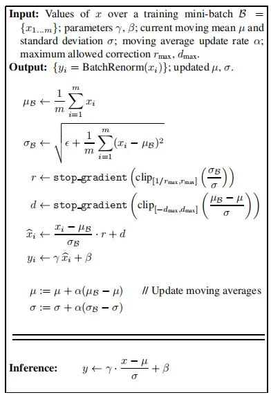 本文的核心思想就是:训练过程中,由于batchsize较小,当前minibatch统计到的均值和方差与全部数据有差异,那么就对当前的均值和方差进行修正。修正的方法主要是利用到通过滑动平均收集到的全局均值和标准差。看公式:
