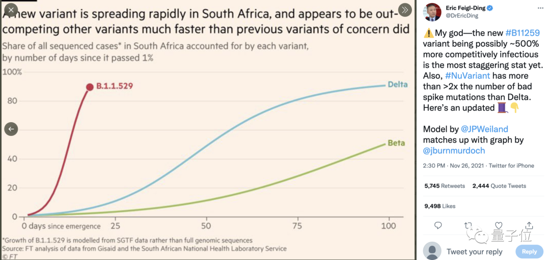 知名流行病学家Eric Feigl-Ding援引流行疾病建模专家JPWeiland的预测,这种变种可能相较于其他变种有超过500%感染率。