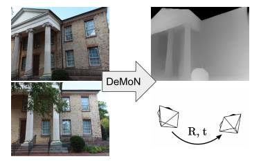 图1. DeMoN的效果图。输入是连续两帧单目相机采集的图像,网络会估计出第一帧的深度图及第二帧的相机运动。