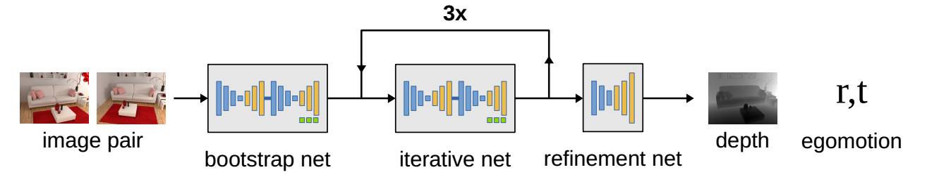 图2. 系统流程图。网络是由一系列编码器-解码器组成的链式结构,会根据光流、深度以及运动关系进行迭代。最后有个精细化的网络用于提升深度图的精度。