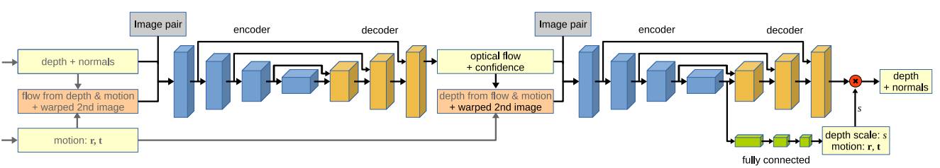 图3. 编码-解码器网络的结构示意图。第一个编码解码器估计了光流及其置信度。第二个估计了深度图和面元的法向量,附加到编码器上的全连接网络估计了相机的运动以及深度的尺度因子。