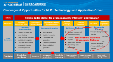 周伯文:我想展示一下我的观点,我们考虑自然语言处理的时候,其实包括了如这个PPT所示的很多层。有人会讲基础层,包括句法、语义,还有包括表征学习等等。其他人讲的是NLP的包括核心能力,括自然语言的理解,怎样生成自然语言,怎样对话,怎样去做一个多模式的推理或者互动。在这核心能力之上,可以看一下有很多的NLP应用提供给大家,而它们都会产生巨大的影响,它们的影响力对社会不容小觑。