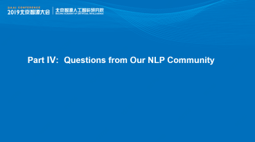 周伯文:我们知道每一个人都意识到BERT模型做出来之后,NLP会发生变化。我们会进行一些预训练的模型,然后在下游的任务上进行Fine-Tuning的分类任务,大家都觉得这是一个重大的竞争,特别是从它带来结果的角度上来看的确是一个突破。另外一方面,像张钹院士等一些杰出的研究者开始提醒我们要注意到深度学习的天花板。大家害怕仅关注深度学习,不关注NLP的一些根本问题。例如BERT出来之后,Pre-train + Fine-tuning成为了NLP任务的新范式,所有的一切NLP任务都可以简化为向量表征的学习外加下游的分类任务的模式识别。大家想一下,这是不是能更好地帮助我们达成对于语义、语境、知识以及对因果等推理学习的目标?