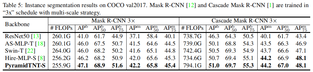 PyramidTNT-S在Mask R-CNN和Cascade Mask R-CNN上的AP-m可以获得更好的AP-b和AP-m,显示出更好的特征表示能力。例如,在ParamidTNN约束上,MaskR-CNN-S超过Hire-MLPS 的0.9AP-b。