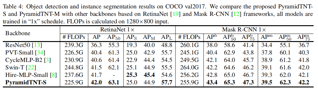 对于COCO检测,PyramidTNT-S比现有的Transformer和MLP检测模型以更少的计算成本实现42.0的mAP。