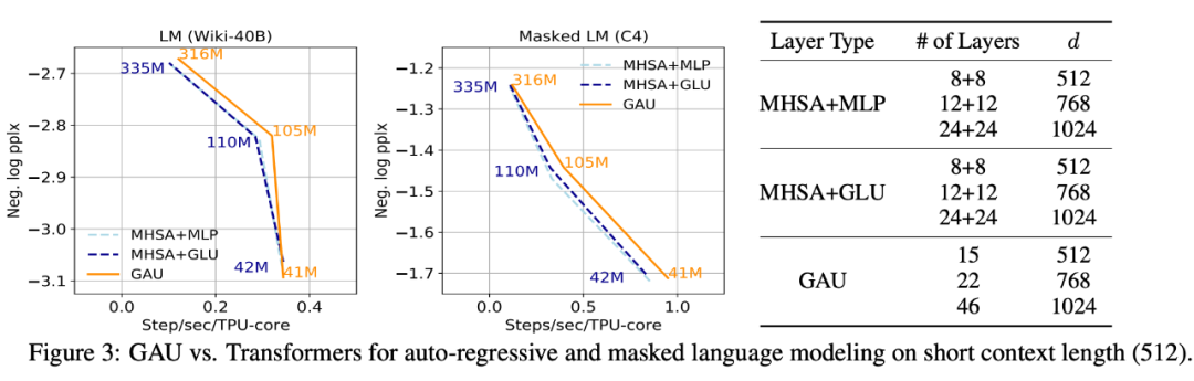 第一个是新设计的门控注意力单元 GAU 与标准的多头注意力之间 MHSA 的比较,其实也就是 FLASH-Quad 和标准 Transformer 的比较了,如下图: