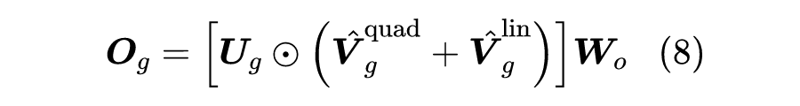 最后,将两种 Attention 结果结合起来,整合到 GAU 中,得到线性版本的 GAU