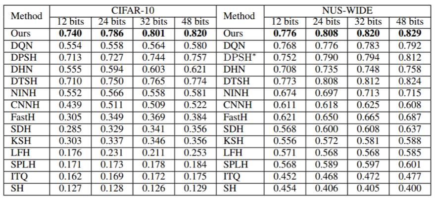 表 1:第一组实验设置下不同方法的 MAP。NUS-WIDE 数据集的 MAP 是根据返回的前 5,000 位邻近值计算的。DPSH * 表示重新运行 DPSH 作者提供的代码。