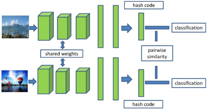 近期有人提出了基于深度学习的哈希算法,它可以同时学习图像表示和哈希编码(hash coding),取得了比传统哈希算法更好的结果。「CNNH」[19] 是早期将深层神经网络与哈希编码融合的工作之一,该工作包括两个阶段来学习图像特征表示和哈希编码。CNNH 的一个缺点是通过学习得到的图像特征表示不能及时反馈给哈希编码。为了克服 CNNH 的这一缺陷,「Network In Network Hashing/NINH」[8] 提出了基于三元组损失函数来表示图像的相似性。研究表明,图像特征表示和哈希编码可以在一个框架内相互促进。DSRH 算法 [24] 通过保留多标签图像间的相似语义信息来学习哈希函数。近年来还提出了其他基于排序的深度哈希算法 [17,21]。除了基于三元组排序方法外,还有一些基于成对标签的深度哈希算法 [9,25]。