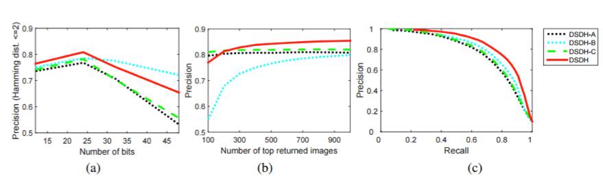 图 1:DSDH-A、DSDH-B、DSDH-C 和 DSDH 在 CIFAR-10 上得到的结果:「a」Hamming 半径为 2 的精度曲线;「b」不同数目最佳返回图像的精度曲线(不确定);「c」具有 48 位哈希编码的精度-召回曲线。