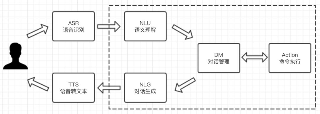 我们一般称将这样的对话式交互系统为语音对话系统(Spoken Dialog System)。这里简单描述下各个组件。