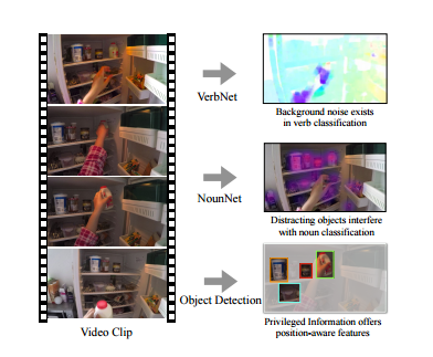 在这种情况下,为了得到鲁棒性较高的预测,他们在其中加入了声音去辅助判断。在第一视角的视频中,声音与行动者(actor)非常靠近,所以声音非常清晰,且不受摄像头拍摄范围的限制,因此声音能提供一些额外的信息。