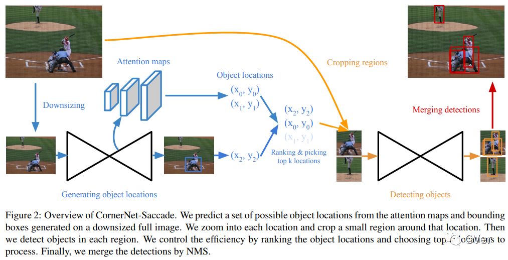CornerNet-Saccade中的 saccades 是 single type and multi-object。CornerNet-Saccade 检测图像中可能的目标位置周围的小区域内的目标。它使用缩小后的完整图像来预测注意力图和粗边界框;两者都提出可能的对象位置,然后,CornerNet-Saccade通过检查以高分辨率为中心的区域来检测目标。它还可以通过控制每个图像处理的最大目标位置数来提高效率。具体流程如下图所示。