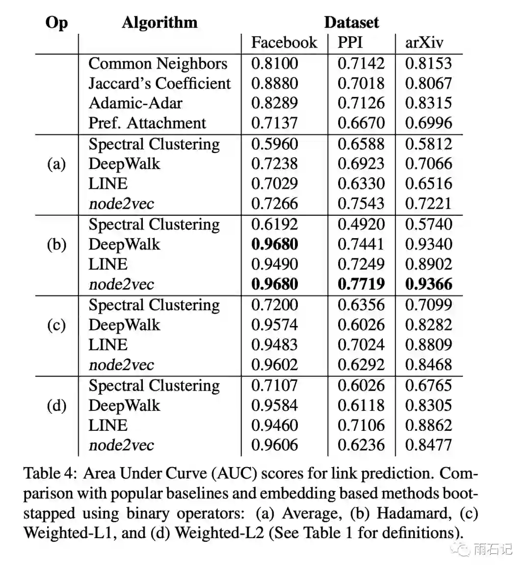 而对于边预测来说,结果如下,可以看到node2vec和DeepWalk两个一档,比其他方法强很多;而node2vec也比DeepWalk强一些。