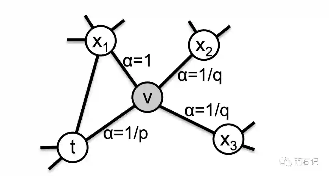 对于节点x和它的上一个节点t,x要转移到的目标节点的权重πvx由alpha来决定,如果节点是t,那么概率为1/p,如果节点到t的距离是1,那么权重就为1,如果节点到t的距离是2,那么概率为1/q。如下图所示: