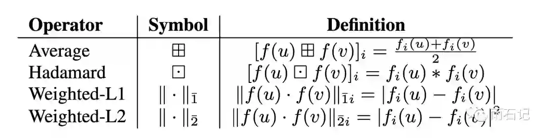 在得到的节点的embedding之后,可以通过对一条边的两个节点的embedding做操作得到边的embedding。可以采用的操作如下: