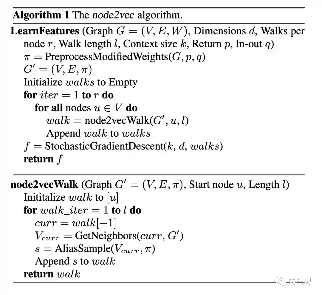 在上面的算法中,node2vecWalk用来得到随机序列,其中AliasSample用来计算概率并采样。