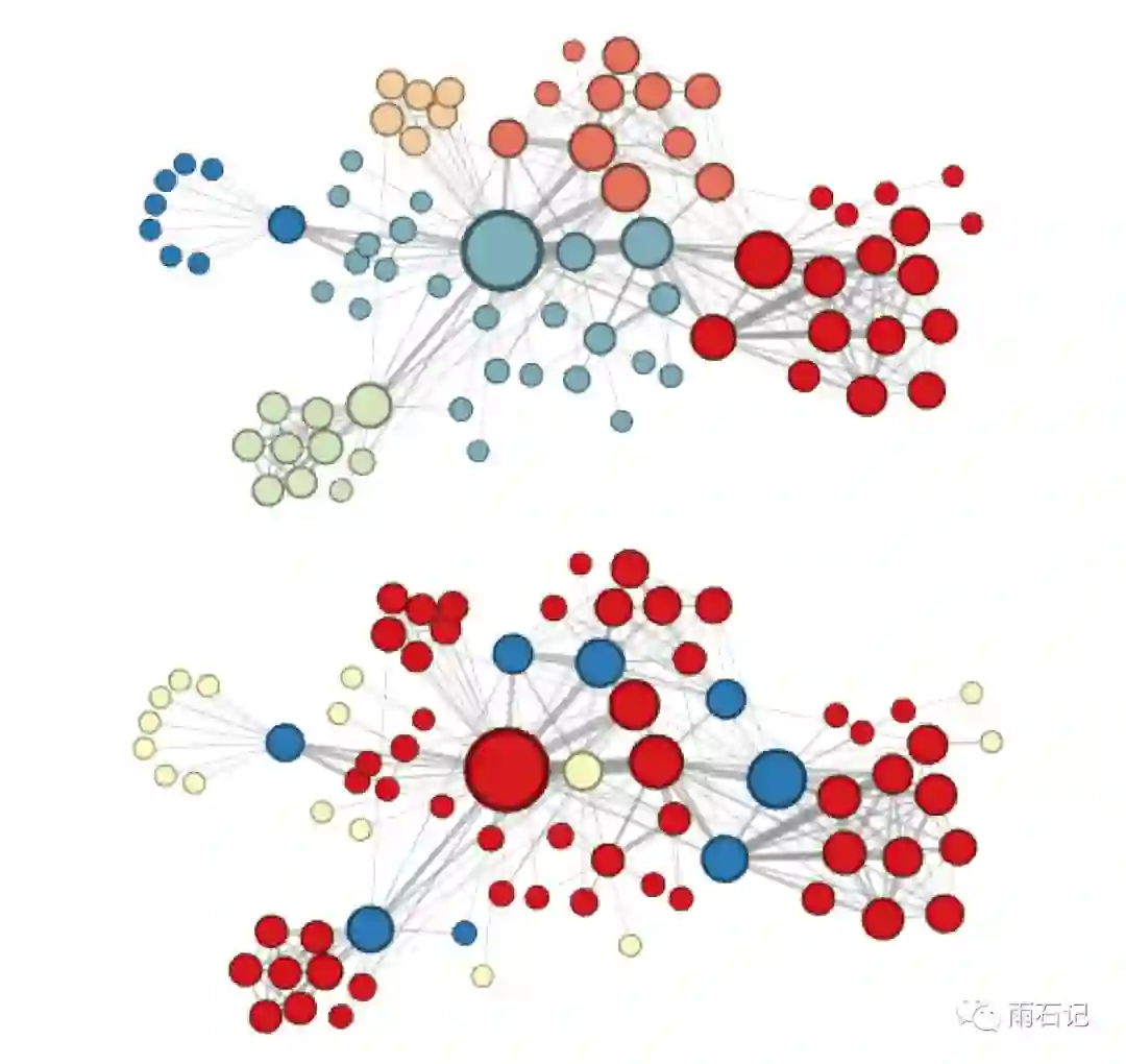 其中上图中的上半部分,参数为p=1, q=0.5,即倾向于BFS,所以学到的类别更强调连接性。下半部分,参数为p=1, q=2,倾向于DFS,学到的类别更强调结构性。