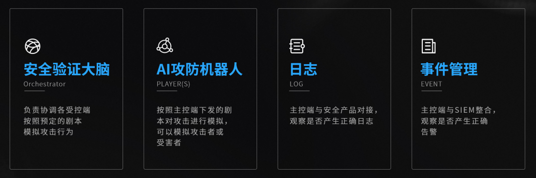 其中,安全验证大脑会指挥 Ai攻防机器人扮演攻击或者被攻击的角色,也会下发演练的剧本。