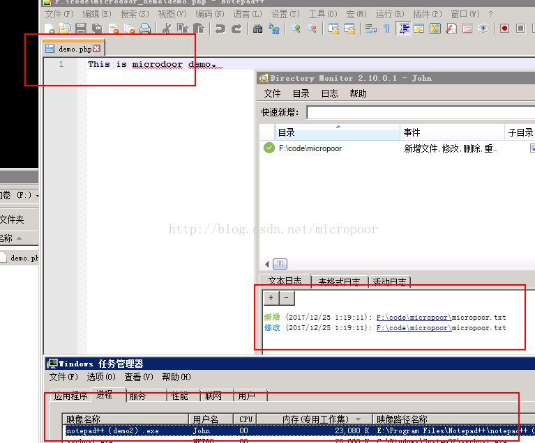 使用 notepad++(demo2).exe 打开以 php 结尾的 demo.php ,来触发 microdoor,并且生成了 micropoor.txt