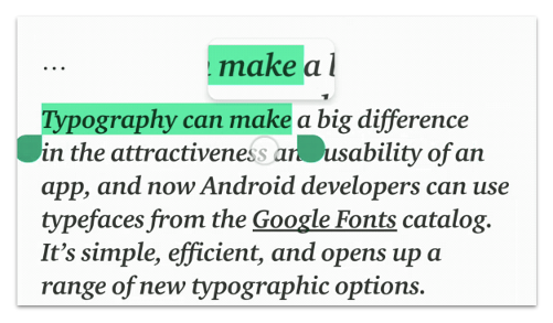 拖动选择图标时会显示放大镜,以便于您查看指尖下方的内容。Compose 1.1.0 已支持在所选择的文本字段中使用放大镜,Compose 1.2.0 在文本字段和 SelectionContainer 中都支持放大镜。Compose 放大镜也得到了增强以匹配 View 中放大镜的精确行为。
