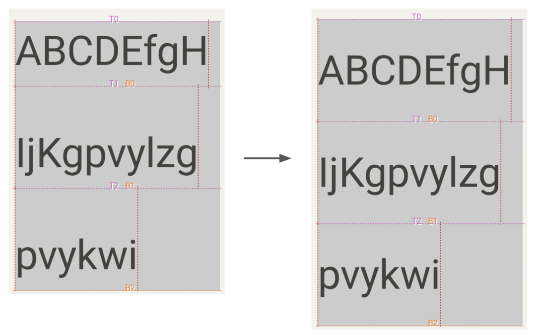 我们在问题跟踪器中定位到了得票最高的问题之一,并通过将 includeFontPadding 设置为自定义参数来解决它。我们推荐您将该值设为 false,因为这会使布局中的文本更精确地对齐。我们计划在未来的版本中将 false 设为默认值。如果将值设为 false 导致您的应用出现问题,请在上述错误报告中告知我们。此外,当 includeFontPadding 被设置为 false 时,您可通过设置 lineHeightStyle 参数来调整 Text 可组合项的行高。两个参数结合使用的效果如下: