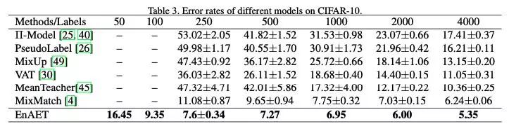 在CIFAR10上,EnAET首次对仅有100张有标注图片的情况进行实验,取得了9.35%的错误率,同时在250张有标注图片分类任务下,相比于以前的SOTA,成功将错误率从11.08%下降到7.6%。具体对比如下: