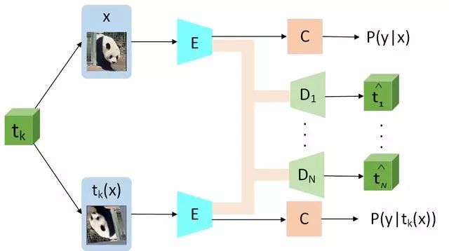 简而言之,针对半监督中的分类网络,将其划分为两部分:编码器E和分类器C。同时针对不同变换tk提供不同的解码器Dk ,这里所有Dk的网络结构和C保持一致。对于不同变换后的图片和原图,E和C始终共享权重,这样做的原因是希望每种变换都能利用原图和变换后的图片经过E编码的特征预测,从而实现加强E表现性能同时避免过拟合的目标。