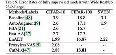 基于模型1,与所有基于该模型的全监督方法进行了对比,其中包括基于数据增强策略搜索的AutoAugment的方法,EnAET模型均取得显著提升,具体对比如图8所示。