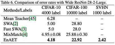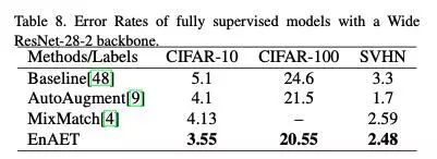 基于模型2,考虑到其他方法没有用过EnAET中的网络结构,因而采用Wide Resnet-28-10结构作为baseline。相比于我们的模型,该模型结构更加复杂并且拥有更多的参数,因此这种比较是公平的。同时对于不同数据集引入了全监督SOTA方法作为对比。