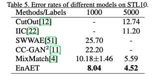 在STL10任务下,EnAET在1000标注样本下将错误率从10.18%下降到8.04%,在使用所有标注样本情况下将错误率从5.59%降到4.52%。
