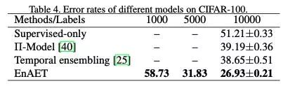 在CIFAR-100上,EnAET首次实验了每类仅有十张图片的情况,取得了58.73的错误率。在经典的10000张有标注图片分类任务下,成功将错误率从38.65%降到了26.93%。具体对比如下: