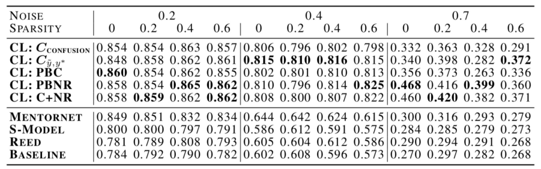 上图给出了CIFAR-10中不同噪声情况和稀疏性情况下,置信学习与噪声学习中的其他SOTA方法的比较。例如在40%的噪声率下,置信学习比之前SOTA方法Mentornet的准确率平均提高34%。