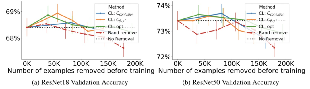 上图给出了分别去除20%,40%…,100%估计错误标注的样本后训练的准确性,最多移除200K个样本。可以看出,当移除小于100K个训练样本时,置信学习框架使得准确率明显提升,并优于随机去除。