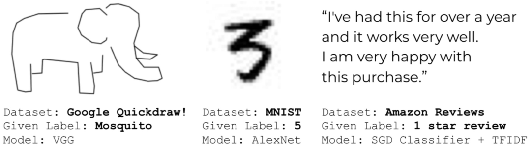 在实际工作中,你是否遇到过这样一个问题或痛点:无论是通过哪种方式获取的标注数据,数据标注质量可能不过关,存在一些错误?亦或者是数据标注的标准不统一、存在一些歧义?特别是badcase反馈回来,发现训练集标注的居然和badcase一样?如下图所示,QuickDraw、MNIST和Amazon Reviews数据集中就存在错误标注。