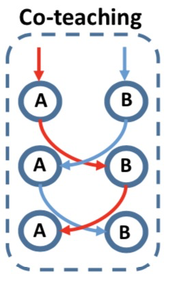 如上图所示,Co-teaching的基本假设是认为noisy label的loss要比clean label的要大,于是它并行地训练了两个神经网络A和B,在每一个Mini-batch训练的过程中,每一个神经网络把它认为loss比较小的样本,送给它其另外一个网络,这样不断进行迭代训练。