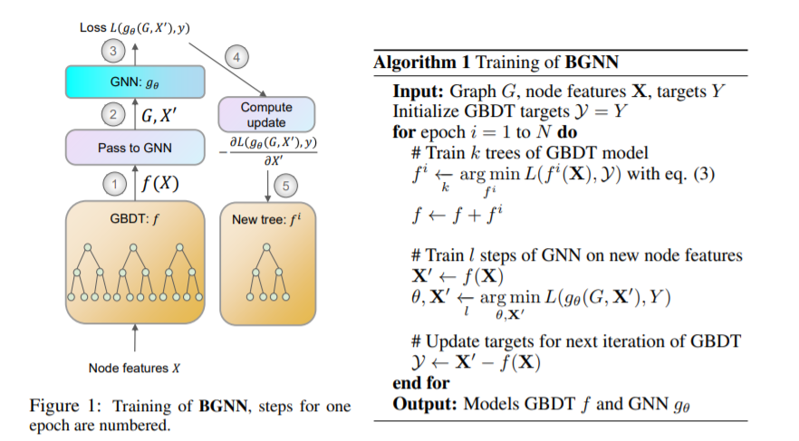 BGNN(GBDT和GNN进行端到端培训)的训练如下图1所示,在算法1中,介绍了结合GBDT和GNN的BGNN模型的训练,以解决任何节点级预测问题。