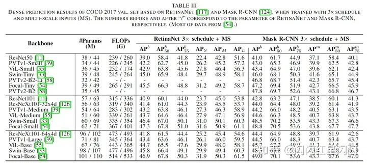作者在本文中回顾了许多用于图像分类的基于 Transformer 的主干。这些主干可以很容易地合并到各种框架中(例如,MaskR-CNN、RetinaNet、DETR 等)来执行密集预测任务。除了一般的改进外,它们中的一部分也有利于改进密集预测任务。层次结构将 Transformer 构造为一个从高分辨率到低分辨率的过程来学习多尺度特征,如 PVT。局部增强结构将主干构建为局部到全局的组合,以有效地提取短程和长程的视觉依赖性并避免二次计算开销,例如 Swin-Transformer、ViL 和 Focal Transformer。下表3在密集预测任务中比较了基于视觉 Transformer 框架的模型。基于 Transformer 的主干比当前 CNN 模型的性能高 2-6.8%,这证明了 Transformer 在密集预测方面的有效性。