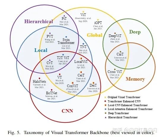 受到在 NLP 中 Transformer 优异发展的启发,一些研究人员试图将 Transformer 引入图像分类。与传统CNN相比,Vision Transformer(ViT)首次在主流分类基准上实现了类似甚至更高的性能。本节全面回顾了 2021 年 6 月之前发布的 40 多个 Transformer 主干,并根据其动机和实现将它们分为六类,如下图 5 所示。