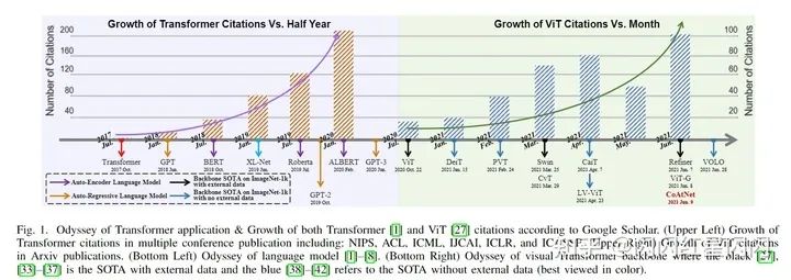 如上图左边所示,Transformer 逐渐成为自然语言处理 (NLP) 的主要深度学习模型。从上图右图所示,在过去的一年中,针对不同的领域提出了数百种基于 Transformer 的视觉模型。