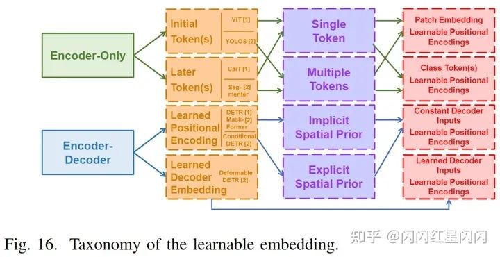 Transformer 模型采用可学习的嵌入来执行不同的视觉任务。从监督任务的角度来看,这些嵌入可以分为类标记、目标查询和掩码嵌入。从结构上看,它们之间是有内在联系的。最近的 Transformer 方法主要采用两种不同的模式:仅编码器结构和编码器-解码器结构。每个结构由三个层次的嵌入组成,如上图 10 所示。从位置层次,学习嵌入在仅编码器的 Transformer 中的应用被分解为初始令牌(initial token)和后期令牌(later token),而学习的位置编码和学习的解码器输入嵌入被应用于编码器-解码器结构。从数量层面来看,仅编码器的设计会应用不同数量的令牌。例如,ViT 家族和 YOLOS 将不同的数字标记附加到初始层,而 CaiT 和 Segmenter 利用这些标记来表示最后几层的不同特征。在编码器 - 解码器结构中,解码器的学习位置编码(目标查询或掩码嵌入)在显式 [28]、[137] 或隐式 [69] 中附加到解码器的输入中。与常数输入不同,Deformable DETR 采用学习嵌入作为输入并加入到编码器的输出。
